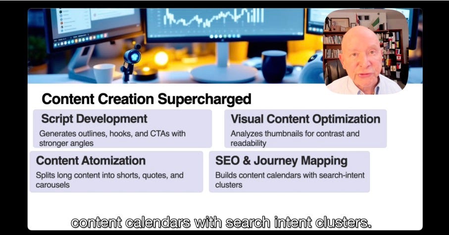 And then there's content production, where it goes through and it's going to create personalized outreach and multi format content. I love it. Giving you the ability to create the content of video, or I should say they picture the video will probably come with over there in Sora, S O R A, with ChatGPT's brother, which is owned by OpenAI as well. Really good progress. Those guys at OpenAI are making some great progress. We really appreciate what they're doing. If any of you watching this, thank you very much for what you're doing. And the analytics and optimization is gonna identify trends and recommend improvements, showing you what can be done, how this can work, and what can be done.